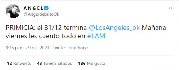 "Primicia: el 31/12 termina Los Ángeles de la mañana. Mañana viernes les cuento todo en LAM", contó el conductor, sorprendiendo a todos por la noticia y dejando abierto si es definitivo el desenlace del programa o volverá el año que viene tras un descanso de la pantalla.