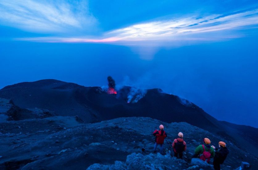 Hacia el cráter del volcán Estrómboli El Estrómboli es como una bestia negra que escupe fuego y furia en medio del mar Tirreno. Este volcán-isla de 924 metros es muy activo y lleva unos 2.000 años entrando en erupción casi de forma continua. Aun así, todavía está permitido subirlo, siempre y cuando sea en una ruta guiada. Las salidas hasta sus flancos cenicientos suelen partir a mediodía o primera hora de la tarde para poder ver la espectacular puesta del sol sobre el mar desde la cima y, también, para apreciar todo el efecto de la pirotecnia magmática al rojo vivo del volcán en el cielo nocturno. El descenso se completa con frontales, bajo la luz de la luna, el brillo de las estrellas y el de las luces de la Italia continental bailando entre las olas. Se parte y se regresa desde el pueblo de Estrómboli, y son apenas ocho kilómetros de ida y vuelta. Una experiencia única. ALAMY