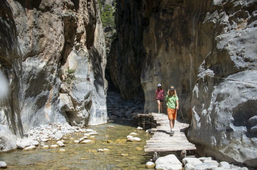Garganta de Samaria (Grecia): un desfiladero entre las Puertas de Hierro Creta cuenta con uno de los cañones más largos de Europa, la garganta de Samaria, que se puede recorrer en un día. La ruta empieza con un marcado descenso al cañón, de unos 600 metros, y a unos seis kilómetros el paisaje se anima, cuando se llega al pueblo abandonado de Samaria y la garganta se estrecha. En un momento dado pasaremos entre las Sideroportes (Puertas de Hierro), unos muros de piedra con una separación de apenas 3,5 metros. Hacia el final, la garganta se abre dando paso a la playa de guijarros de Agia Roumeli, donde darse un baño refrescante en el mar de Libia, para luego reponer fuerzas en alguna taberna junto al mar. Se puede tomar un ferri de vuelta a pueblos más grandes y desde allí continuar en autobús. La ruta por el desfiladero parte de Xyloskalo, cerca de Omalos, y finaliza después de caminar 16 kilómetros en Agia Roumeli. PAUL BIRIS GETTY IMAGES