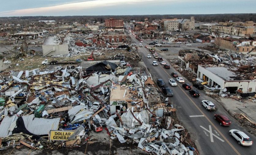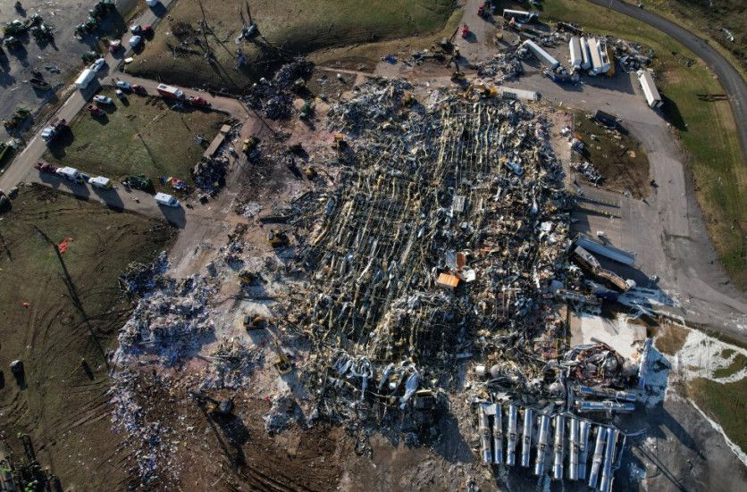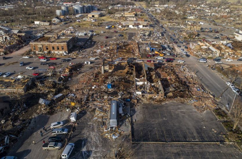 Vista aérea de los daños causados por el tornado a su posa por la localidad de Mayfield (Kentucky). El gobernador de este Estado, Andy Beshear, alertaba de que "el número total de muertos podría ser mayor de 100. "Los informes son realmente desgarradores", lamentaba Beshear. RYAN C. HERMENS AP