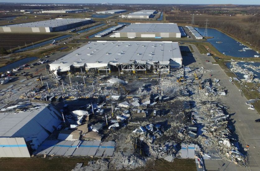 Daños causados en el centro de distribución de Amazon en Edwardsville (Illinois). Para Biden, lo sucedido en la madrugada del sábado está íntimamente ligado al cambio climático. El calentamiento global provoca que los fenómenos meteorológicos sean cada vez "más intensos", aseguró el demócrata. DRONE BASE REUTERS