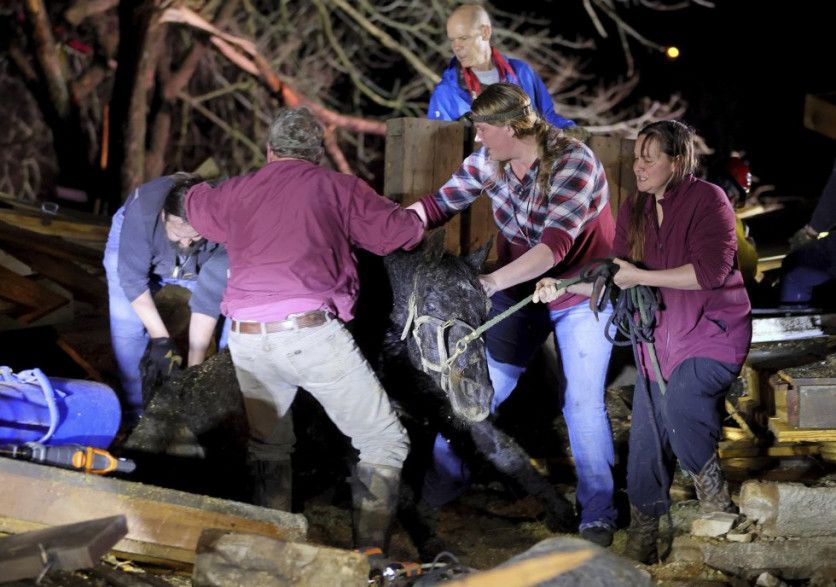 Un caballo es rescatado de un granero derrumbado en el condado de St. Charles (Misuri). En Estado de Tennessee, al menos a tres personas han muerto a causa del temporal, según ha confirmado el portavoz de la Agencia de Emergencias del Estado, Dean Flener. DAVID CARSON AP