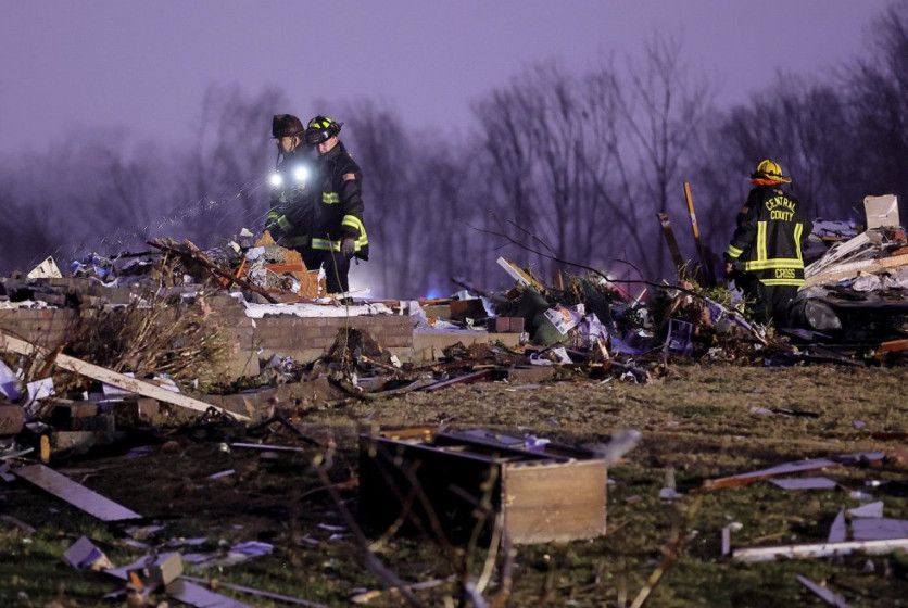 Un grupo de bomberos registra un campo de escombros que provenía de una vivienda que fue arrancada de sus cimientos en el condado de St. Charles (Misuri). Durante varios días se ha ido advirtiendo a las comunidades a lo largo de la frontera estatal entre Kentucky y Tennessee que era posible que se produjeran tornados fuertes. DAVID CARSON AP