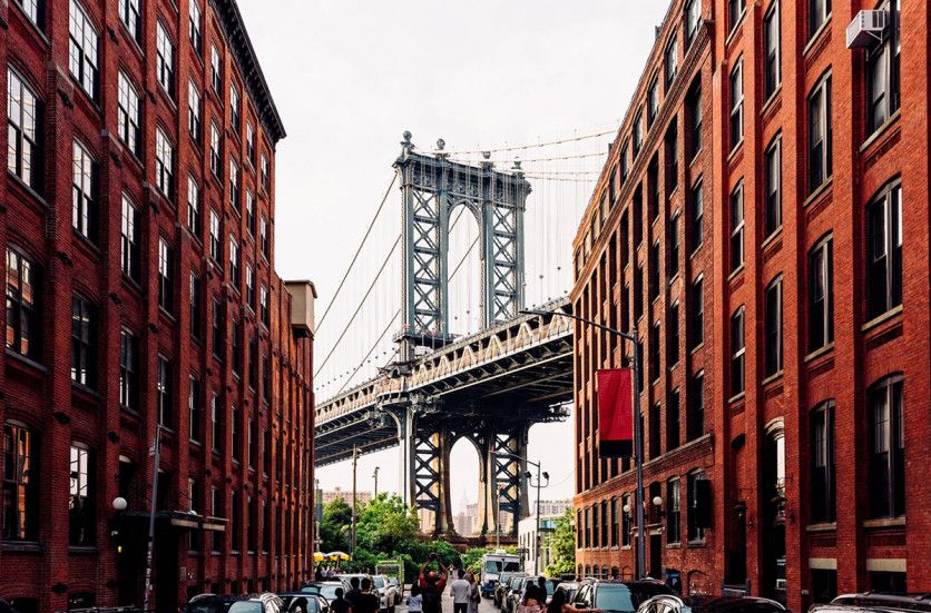 El cruce de las calles Washington y Water en el barrio de Dumbo, en Brooklyn, con sus adoquines, edificios simétricos y la repentina visión del puente de Manhattan es uno de los lugares más visitados por los turistas en Nueva York, Estados Unidos (Getty Images)