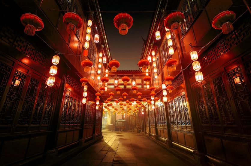 La calle Jinli en Chengdu, China, es hermosa durante todo el año pero no hay mejor momento para ver su magia que durante el Año Nuevo chino, cuando los lugareños iluminan las calles con motivos ceremoniales (Getty Images)
