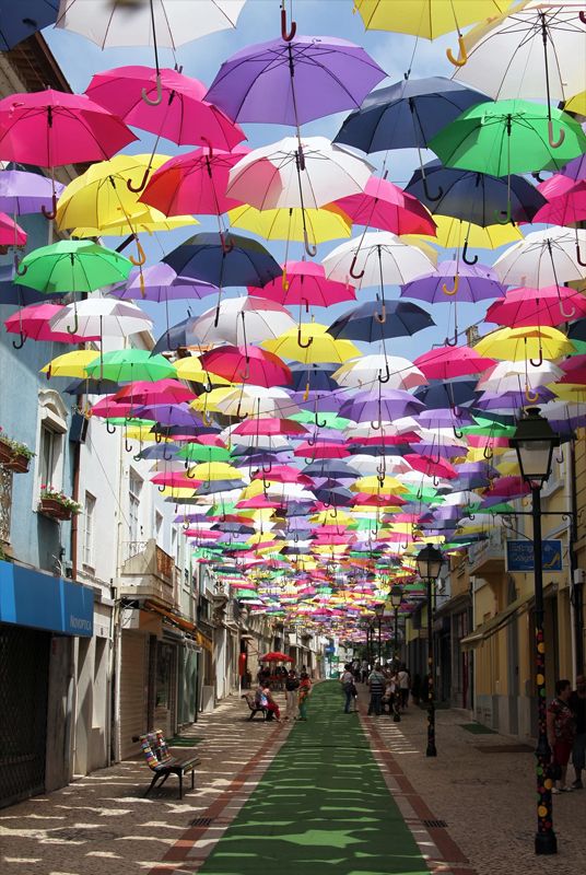 Desde 2011, en unas calles angostas de Águeda, en Portugal, se cuelgan centenares de paraguas de colores que dan sombra a los peatones cuando las temperaturas se disparan cada verano (Getty Images)