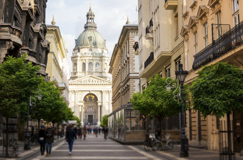 La calle peatonal Zrinyi Utca en Budapest tiene algunas de las mejores vistas de la famosa Basílica de San Esteban de Hungría (Getty Images)