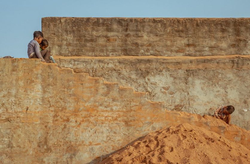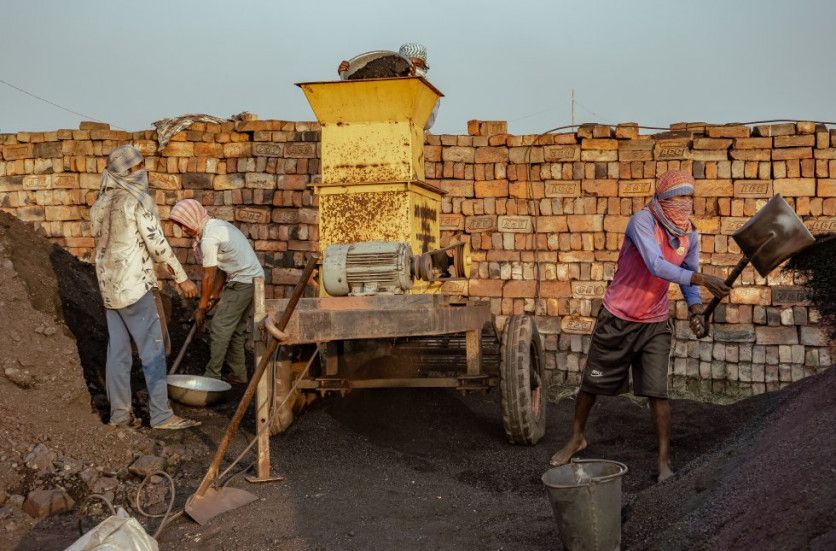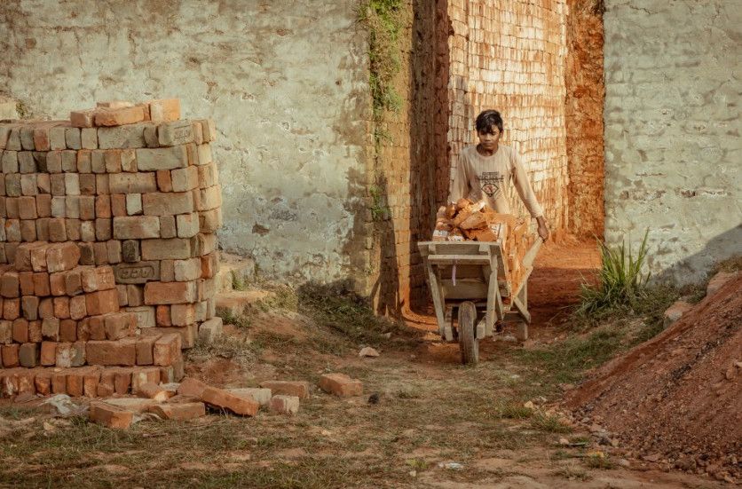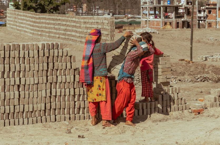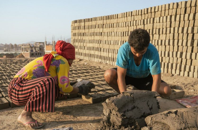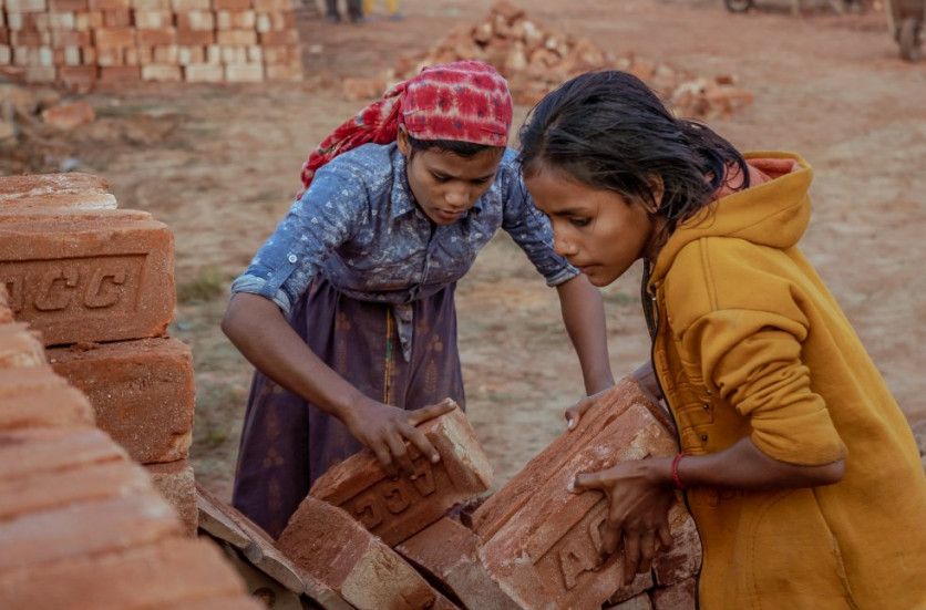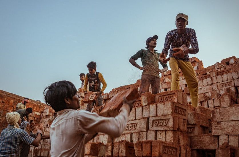 Dos niños de corta edad trabajan en el horno de Biratnagar. Según los últimos datos el 20% de los menores de edad trabajadores desempeña su labor en entornos peligrosos como la agricultura, las construcciones y la industria del ladrillo. Los informes publicados en 2021 por la Organización Internacional del Trabajo (ILO) muestran que en los hornos de Nepal trabajan entre 20.000 y 30.000 niños.