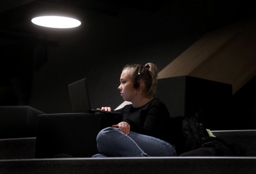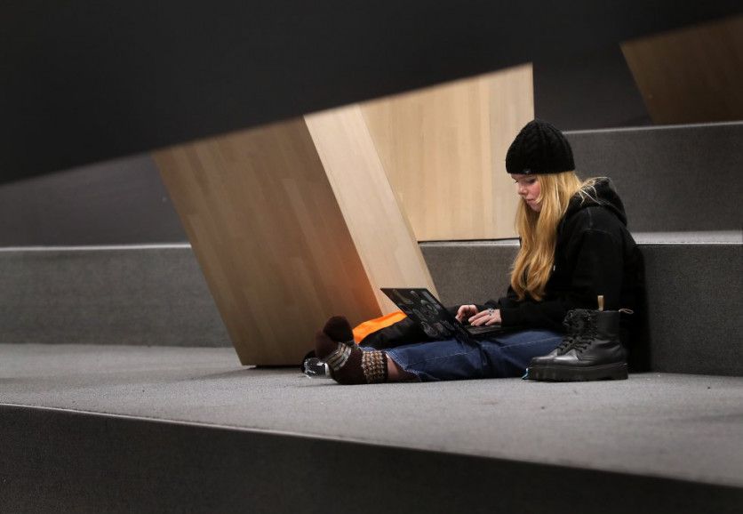 Una estudiante trabaja con su ordenador en una escalinata cubierta con moqueta en la primera planta. JAIME VILLANUEVA