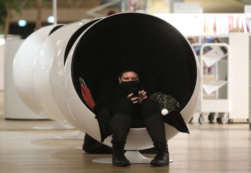 Una mujer descansa con su teléfono móvil en uno de los sillones huevo de la última planta. JAIME VILLANUEVA