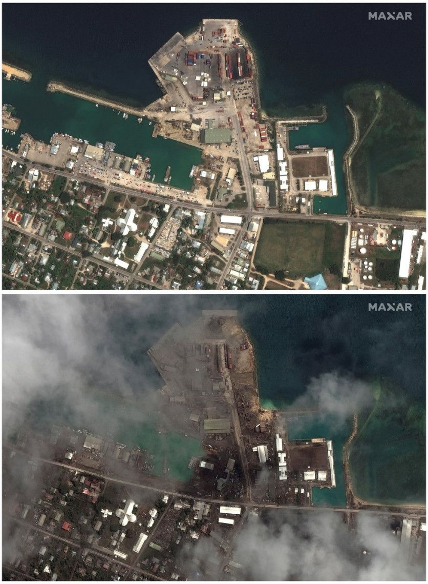 Una combinación de imágenes de satélite muestra las principales instalaciones portuarias antes de la erupción principal del volcán Hunga Tonga-Hunga Ha'apai el 29 de diciembre de 2021 (arriba) y la misma zona el 18 de enero de 2022, en Nuku'alofa, Tonga.