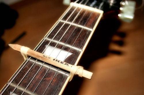 Si te falta la cejilla de una guitarra en un concierto, nada como un lápiz para salir del paso. Y las notas afinanadas saldrán sin querer.