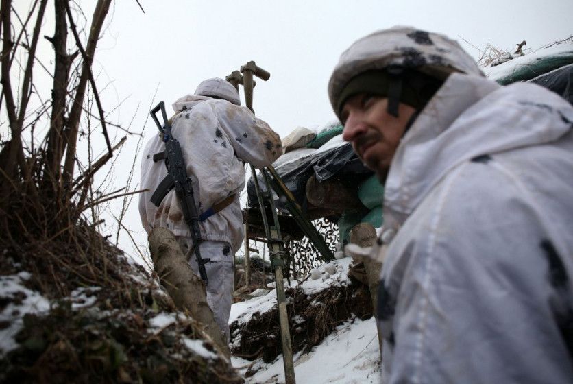 Militares de las fuerzas ucranias permanecen en una trinchera en la línea del frente que les separa de los combatientes respaldados por Rusia, cerca de la aldea de Verkhnetoretske, en la región de Donetsk, el 18 de enero. ANATOLII STEPANOV AFP