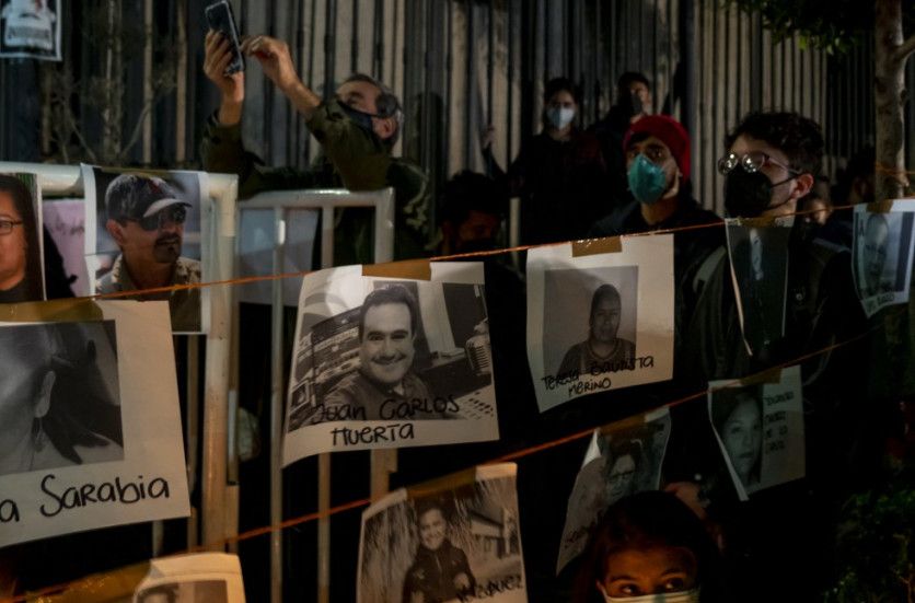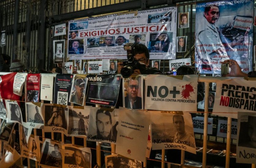 En las escaleras de la Secretaría de Gobernación, unos reporteros instalaron un pequeño altar con imágenes de periodistas asesinados en México.