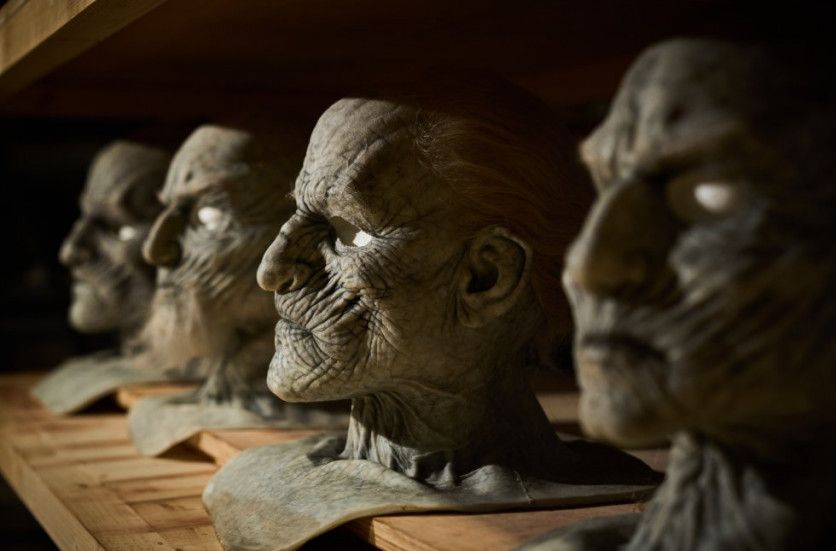 Caminantes blancos Además de los sets de rodaje originales, el recorrido dedica una amplia sala a recrear y, sobre todo, poner en valor el arduo trabajo de diseño y producción que hay detrás de la serie, uno de cuyos departamentos especializados era el de prótesis faciales. En la imagen, las que ponían rostro a los inquietantes caminantes blancos, que habitan al norte de El Muro.