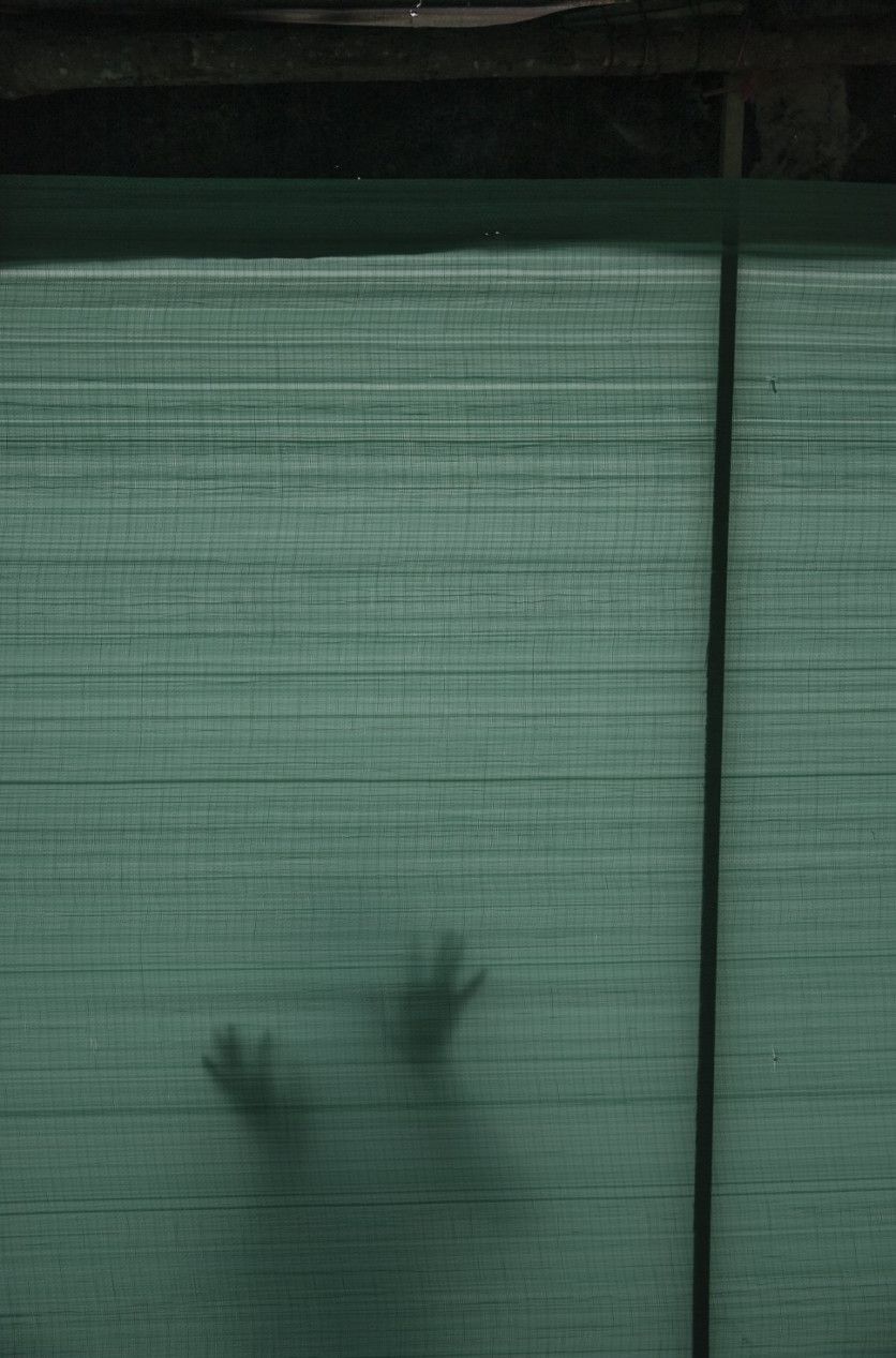 Las manos de la migrante venezolana Maryorie Paola a través de la tela que sirve de pared en su casa en Cúcuta, Colombia. Mayo de 2018. FABIOLA FERRERO