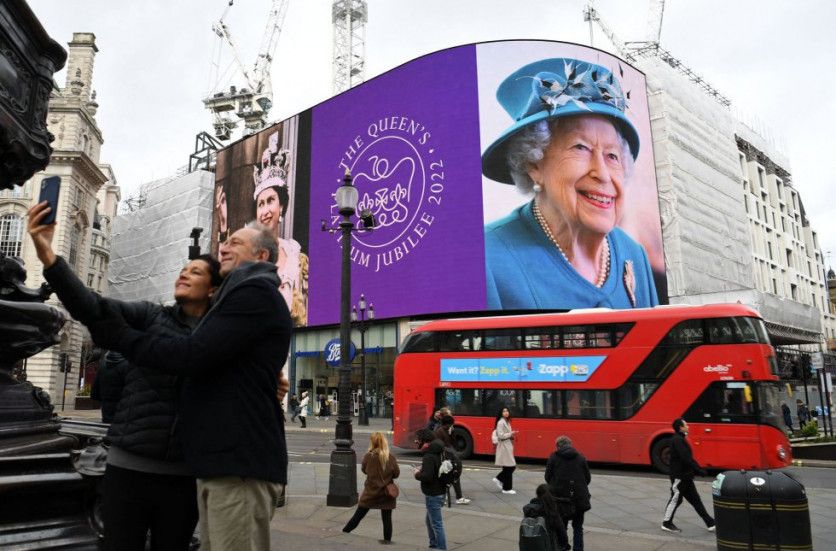 Una pareja haciéndose un 'selfi' delante de las pantallas digitales de Picadilly Circus (Londres), que durante todo el día proyectan imágenes de la monarca. DANIEL LEAL AFP