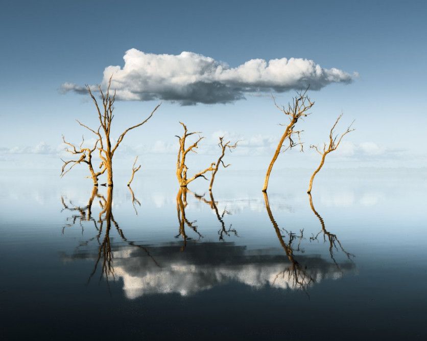 Coreografía de agua y viento El tercer puesto que cierra el podio en la categoría de foto única ha sido para esta lírica composición del australiano Benjamin Goode que recuerda a un cuadro de Salvador Dalí. Bajo el título 'Reflector, la fotografía muestra una suerte de coreografía en la que un grupo de arbustos parece bailar al ritmo del viento que mece sus ramas desnudas. La imagen está tomada a orillas del lago Bonney, en la región australiana de Riverland (en el sur del país). BEN GOODE