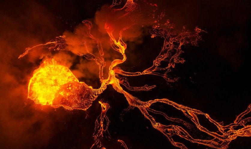 Las profundidades del infierno En el capítulo de fotografía aérea, la distinguida ha sido esta poderosa imagen del estadounidense Chris Byrne. 'Las profundidades del infierno' muestra la erupción de lava del volcán Fagradalsfjall, en la península islandesa de Reykjane. CHRIS BYRNE