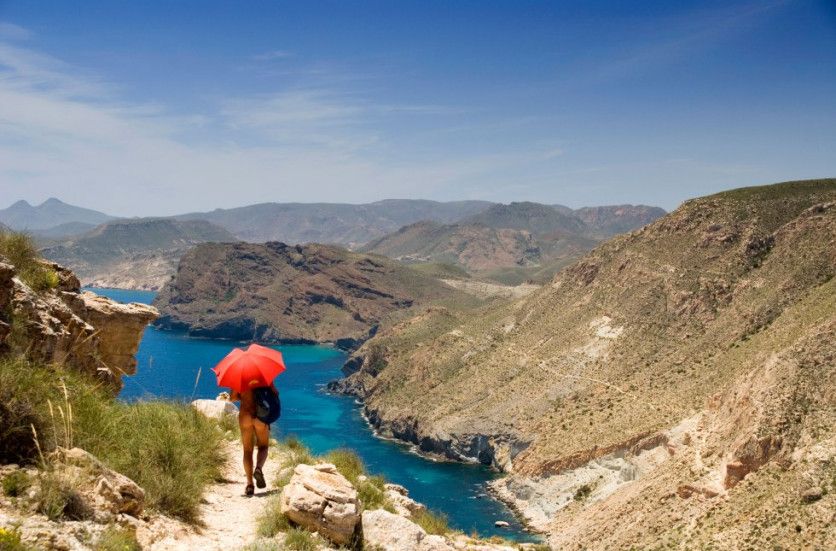 De Las Negras a Agua Amarga (Almería) Cabo de Gata, en el vértice suroriental de España, es uno de los territorios más áridos de Europa. Un inhóspito paisaje volcánico bordeado por acantilados costeros y rocosos promontorios de formas surrealistas que esconden calas de aguas azul intenso. Aunque se puede caminar gran parte de los 60 kilómetros de su litoral, uno de los mejores tramos enlaza las poblaciones de Las Negras y Agua Amarga. La ruta puede iniciarse, hacia el noreste, desde la playa de Las Negras, contemplando la bahía de este discreto pueblo de pescadores, imán para visitantes y residentes de lo más variopinto ('hippies', autocaravanistas, buceadores, aficionados al playeo nudista), antes de girar hacia el interior (casi inaccesible por carretera). El camino sube y serpentea desde lo alto con vistas a las torres que vigilaban estos valles y costas. El aislado castillo de San Pedro, abandonado en los años sesenta del pasado siglo, anuncia la llegada a la cala homónima (en la foto), enclave repoblado desde hace decenios por una comunidad alternativa instalada en rehabilitadas moradas de piedra, tiendas de campaña e incluso cuevas. Una mezcla de rastafaris, perros y paneles solares, más un par de chiringuitos muy rústicos que venden bebidas, bocadillos y pizzas (cuando deciden abrir). El camino de Las Negras a Agua Amarga (13 kilómetros) se cubre en unas cuatro horas, y es de dificultad moderada. Eso sí, la sombra escasea. CHRIS KNAPTON ALAMY