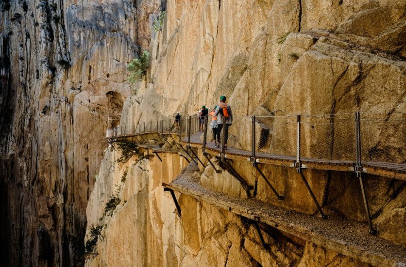 Caminito del Rey (Málaga) En 1921, Alfonso XIII inauguró este caminito instalado, a gran altura, en las paredes verticales de un desfiladero excavado por el río Guadalhorce a 60 kilómetros al noroeste de Málaga, y rehabilitado para el turismo entre 2014 y 2015. El llamado Caminito del Rey consiste en una pasarela de madera de 2,9 kilómetros de largo que cuelga a 105 metros de altura sobre el río y serpentea entre vistas sobrecogedoras del estrecho de Gaitanejos -sus paredes apenas llegan al metro de separación en la sección más angosta- y el cañón de Gaitanes (en la imagen), cuyas paredes alcanzan los 300 metros de altura sobre el Guadalhorce. El voladizo se encontraba tan deteriorado a finales de la década de 1990 (llegó a ser considerado el sendero más peligroso del mundo) que, debido al riesgo que comportaba, se clausuró oficialmente en el año 2000. Tras una restauración que costó 5,5 millones de euros, fue reabierto en 2015 y desde entonces brinda una senda vertiginosa, pero segura y bien acondicionada, para cualquiera que, eso sí, tolere las alturas. La nueva pasarela de madera está instalada justo por encima de la antigua estructura, dejando a la vista el pésimo estado en que se encontraba. La caminata tiene control de acceso constante, solo puede realizarse en dirección norte-sur y sus 7,7 kilómetros (solo ida) se completan en unas dos horas y media. Debido a su popularidad y al número limitado de visitantes diarios, conviene reservar la entrada (10 euros) dos semanas antes, como mínimo. REBECCA CARTER GETTY IMAGES