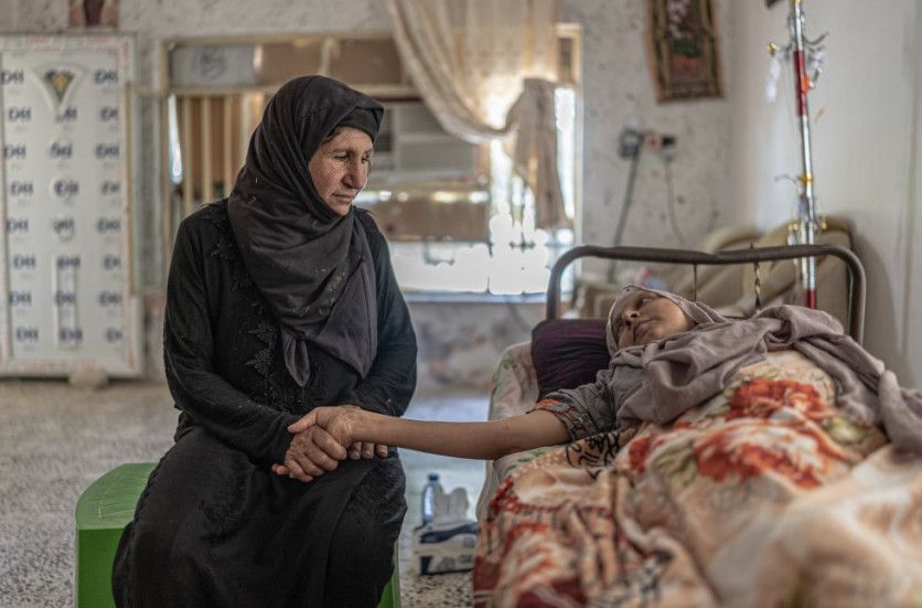 Fátima junto a su hija Dika, de 27 años. Dos de sus niñas fueron alcanzadas por metralla durante un ataque del ISIS y se encuentran en casa, ya que la familia no tiene recursos para costear una internación en algún hospital.