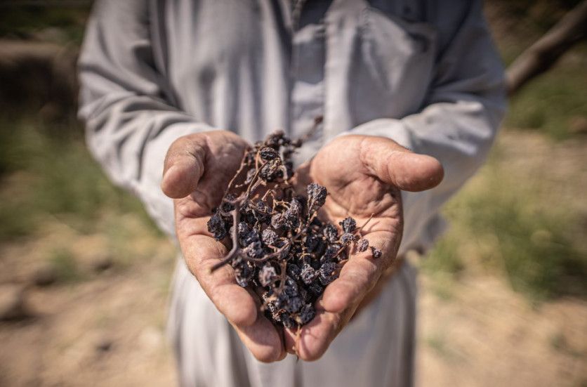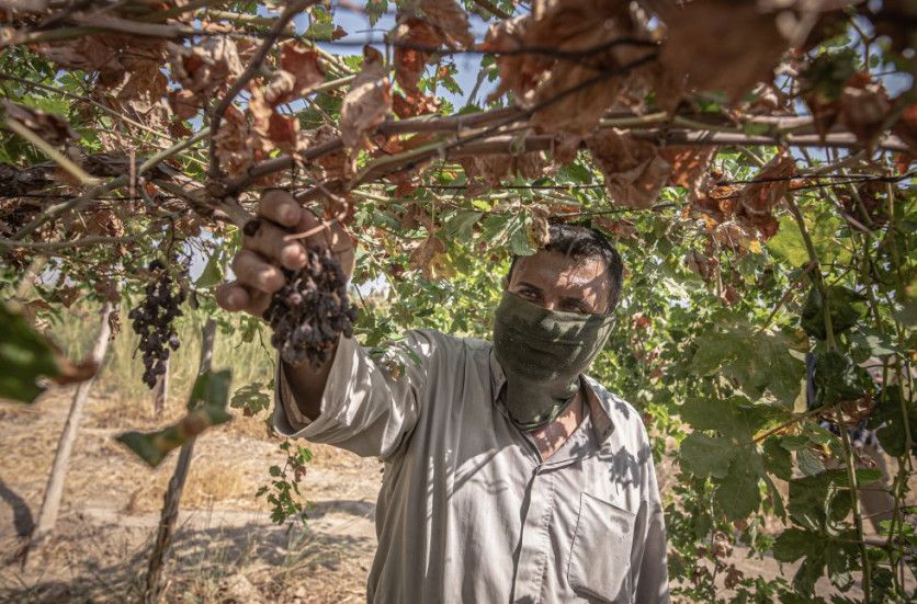 Fadhili muestra el estado en el que ha quedado la cosecha de uva. Los agricultores locales no recuerdan un periodo de sequía tan prolongado como el actual.