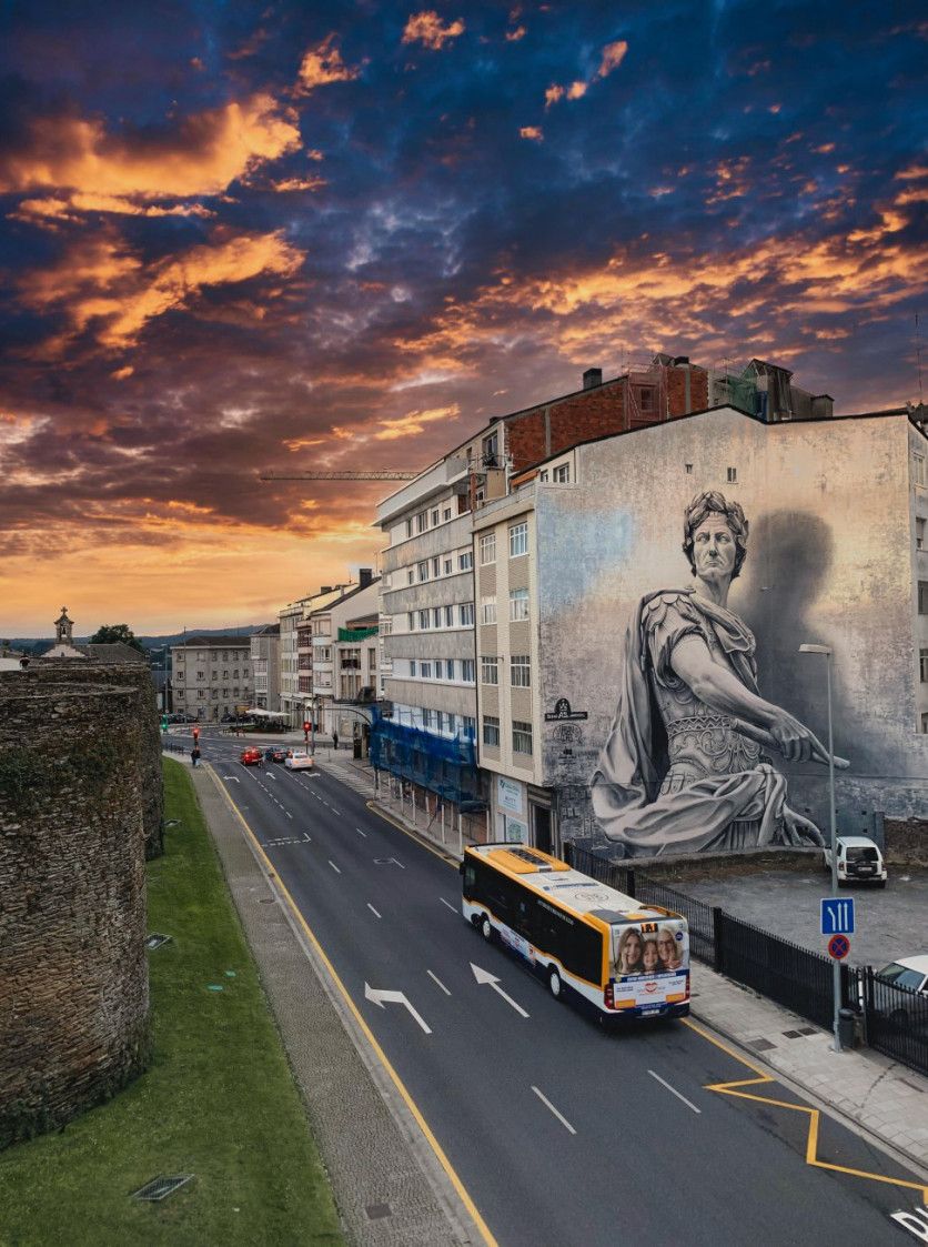 Un enorme Julio César de 20 metros de alto pintado en distintas tonalidades de gris sobre una fachada frente a la muralla de Lugo, obra de Diego As, ha sido elegido como el mejor mural urbano de 2021 por el portal Street Art Cities, una plataforma nacida hace cinco años en los Países Bajos que tiene por ambición documentar todo el arte callejero del mundo. El mural dedicado al emperador romano luce en la parte lateral de un edificio en la Ronda da Muralla que acoge distintas oficinas administrativas del Gobierno español, como la sede en la ciudad gallega de la Confederación Hidrográfica Miño-Sil. DIEGO AS