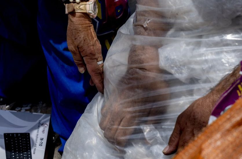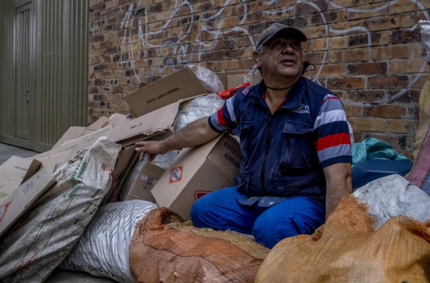 Jadira Vivanco, coordinadora regional de Latitud R, una plataforma enfocada en fortalecer el reciclaje inclusivo, celebra la normativa nacional vigente: "Colombia es quien lleva la batuta en Latinoamérica. Tanto en la parte organizativa del gremio, como en la de políticas públicas. Aquí no se trata de voluntades políticas, sino de una norma de obligado cumplimiento. Estos recuperadores ambientales reciben la misma bonificación que se les da a los camiones de basura por trasladar los residuos a un relleno sanitario", narra por teléfono. En la imagen, Ballén carga una bolsa de materiales para separar.