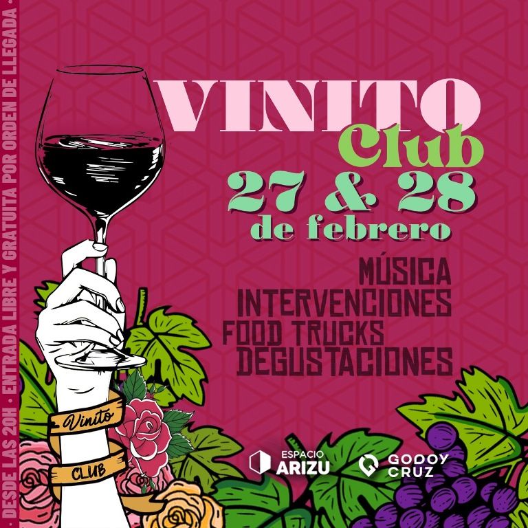 La música y le vino son protagonistas de "Vinito Club", la propuesta organizada por el Municipio de Godoy Cruz que se podrá disfrutar este 27 y 28 de febrero en el Espacio Arizu, lugar que se viene posicionándose como punto cultural de la comuna.