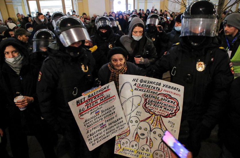Miembros de la policía rusa detiene a una señora mayor durante las protestas en contra de la guerra en la ciuadad de San Petersburgo. Se trata de Yelena Osipova una de las conocidas supervivientes del asedio de Leningrado que tuvo lugar durante la Segunda Guerra Mundial. STRINGER REUTERS