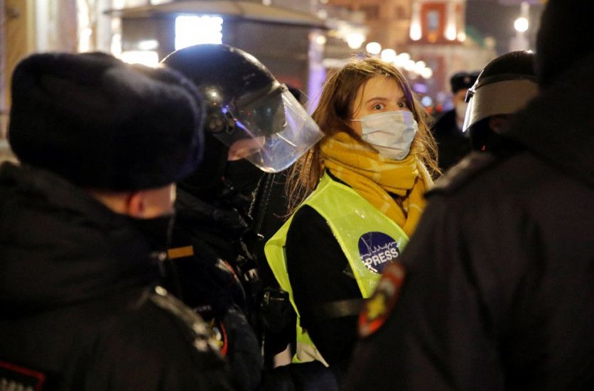 Una mujer con el chaleco de prensa es detenida por las fuerzas de seguridad rusas mientras cubría una de las manifestaciones. El sentimiento en contra de la guerra es generalizado en el pueblo ruso, son muchas las personas que han firmado peticiones en linea para que se acabe la invasión. STRINGER REUTERS