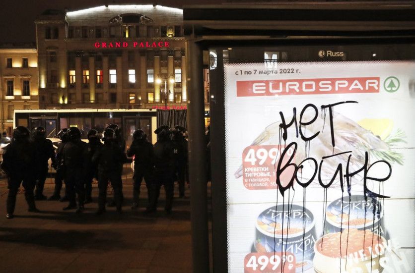 La policía se prepara para dar fin a las protestas en San Petersburgo (Rusia). En la imagen un cartel en el que se lee 'no a la guerra'. NATOLY MALTSEV EFE