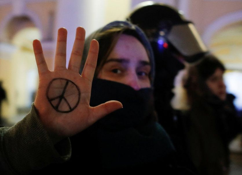 Con el símbolo de la paz pintado en su mano una manifestante es detenida en San Petersburgo (Rusia) STRINGER REUTERS