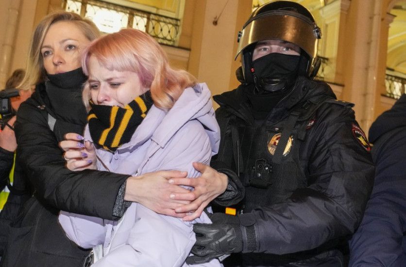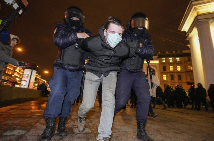 La policía detiene a un manifestante que protestaba en contra de la guerra en Ucrania durante la noche del miércoles en San Petersburgo (Rusia). Los civiles tomaron las calles de varias ciudades para unirse a las protesta que se han dado en todo el mundo. DMITRI LOVETSKY AP