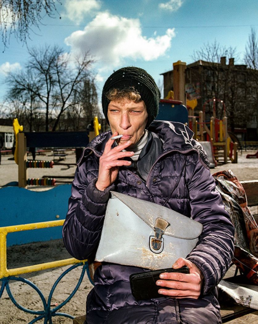 Mujer fumando en un banco en Myrnograd, Donetsk, 2021. MARK NEVILLE