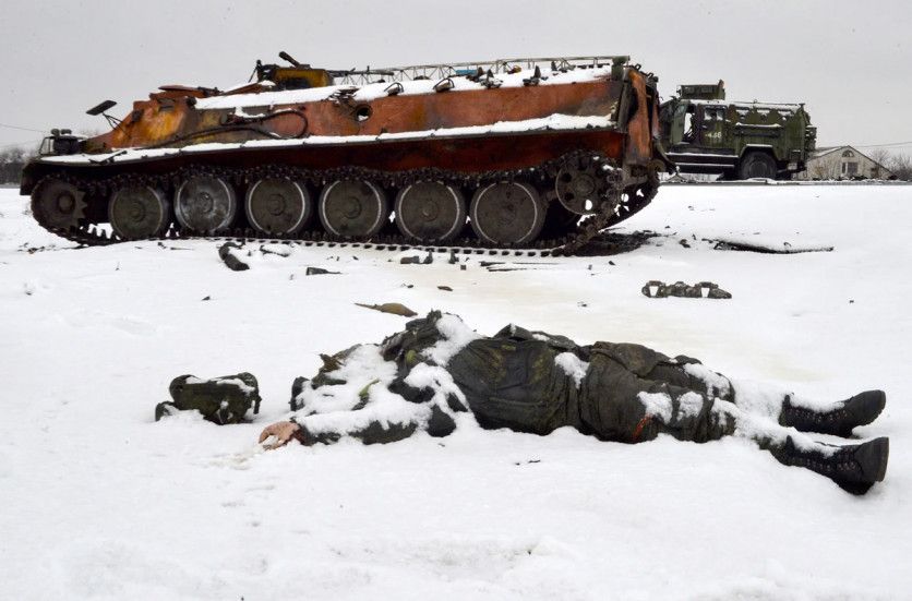 El cuerpo de un militar ruso yace cerca de vehículos militares destruidos al borde de la carretera en las afueras de Kharkiv, luego de la invasión rusa de Ucrania. (Foto de Serguéi BOBOK / AFP)