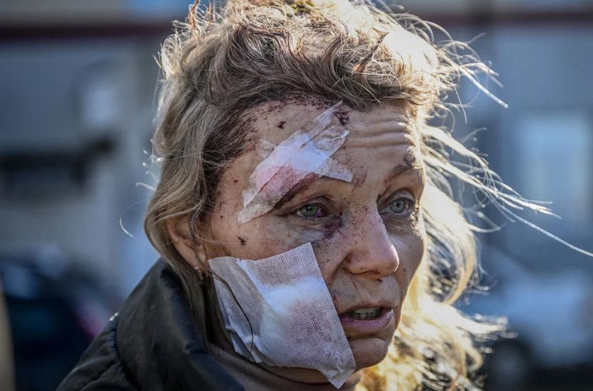 Una mujer herida se encuentra frente a un hospital después del bombardeo de la ciudad de Chuguiv, en el este de Ucrania, cuando las fuerzas armadas rusas intentan invadir Ucrania desde varias direcciones, utilizando sistemas de cohetes y helicópteros para atacar la posición ucraniana en el sur, la frontera. dijo el servicio de guardia. (Foto de Aris Messinis / AFP)