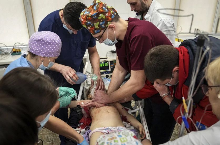 Los médicos realizan RCP a una niña herida durante el bombardeo de una zona residencial, en el hospital de la ciudad de Mariupol, en el este de Ucrania. La niña no sobrevivió. (Foto AP/Evgeniy Maloletka)