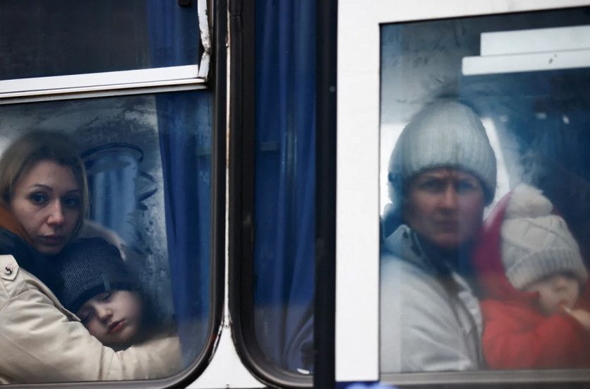 Se ve a mujeres con niños a través de la ventana de un autobús cuando llegan a un centro de alojamiento temporal, después de huir de la invasión rusa de Ucrania, en Korczowa, Polonia. REUTERS/Yara Nardi