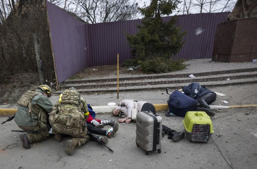 Servicios de emergencias tratan de socorrer a una familia que murió por el impacto de un cohete ruso en Irpin, mientras tratabamn de huir hacia Kiev (AP Photo/Andriy Dubchak)