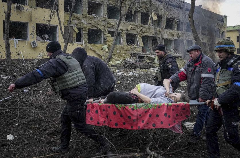 Trabajadores y voluntarios ucranianos de emergencia trasladan a una mujer embarazada entre los restos de un hospital de maternidad dañado por proyectiles en Mariúpol, Ucrania. (AP Foto/Evgeniy Maloletka)