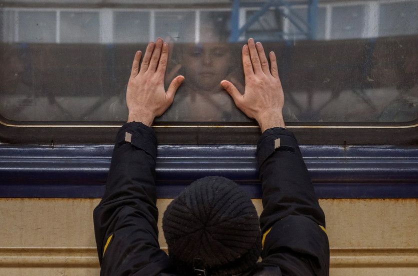 Aleksander, de 41 años, presiona sus palmas contra la ventana mientras se despide de su hija Anna, de 5 años, en un tren a Lviv en la estación de Kiev, Ucrania. Aleksander tiene que quedarse atrás para luchar en la guerra mientras su familia deja el país para buscar refugio en un país vecino. (Foto AP/Emilio Morenatti)