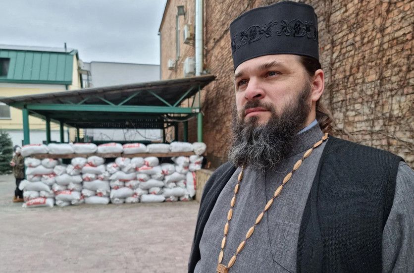 El sacerdote Makary, al frente de un monasterio de 1051, el más antiguo de Ucrania y patrimonio de la humanidad desde 1990. Está dispuesto a tomar las armas para defenderlo detrás de las barricadas que han construido (Joaquín Sánchez Mariño, enviado especial de Infobae)