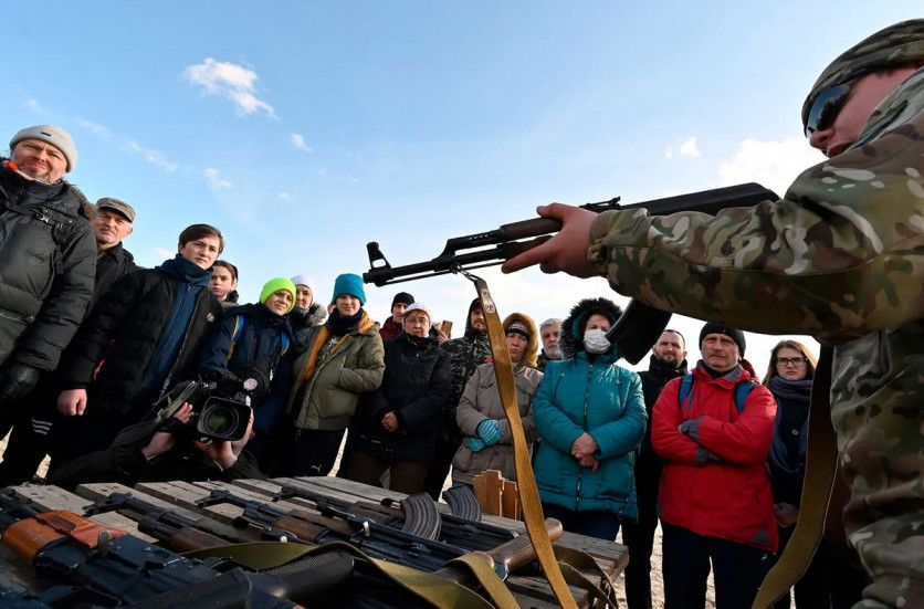 Los residentes asisten a una capacitación abierta organizada para civiles por veteranos de guerra y voluntarios que enseñan el manejo básico de armas y primeros auxilios en una de las playas de la ciudad de Kiyv. (Foto de Genya SAVILOV / AFP)