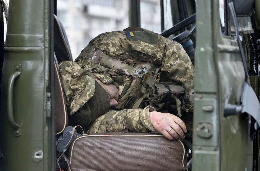 El cuerpo de un militar ruso que vestía uniforme de servicio ucraniano yace dentro de un vehículo después de que él y otros miembros de un grupo de asalto recibieron disparos durante una escaramuza en la capital ucraniana de Kiev. (Foto de Serguéi SUPINSKY / AFP)