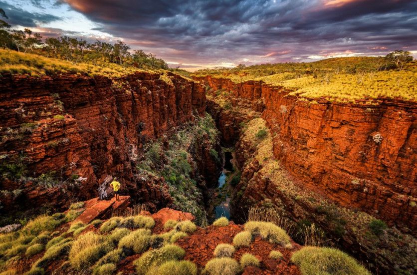 La región de Pilbara (Australia) Por si el viajero no se sintiera ya suficientemente pequeño, y solitario, en la región de Pilbara, una enormidad que ocupa el doble de superficie que el Reino Unido (unos 507.896 kilómetros cuadrados) y está poblada por algo más de 60.000 habitantes, hoy sabemos que este territorio del occidente de Australia alberga la evidencia hecha fósil de algunas de las formas de vida más antiguas de la Tierra: unos 3.600 millones de años. Su cáscara de desierto semiárido guarda en su interior el parque nacional Karijini, uno de los más bellos del mundo con su abrupta sucesión de profundos cañones, cascadas y pozas de agua cristalina, alimentadas por manantiales subterráneos, sobre un fondo de roca roja, rica en mineral de hierro. Rodeado todo de vegetación y vida silvestre.