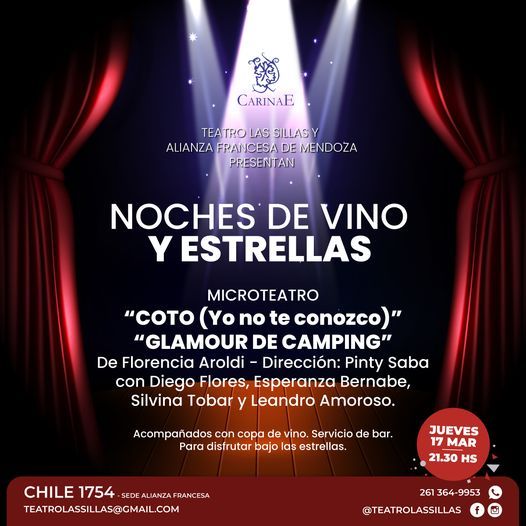 El jueves 17, a las 21.30, en el marco del ciclo "Noche de vino y estrellas" que se realiza al aire libre y con la degustación de una copa de vino, se presentará la obra de microteatro "Glamour de camping", de Silvina Tobar, con Silvina Tobar y Leandro Amoroso. Y "Coto ( yo no te conozco) " con Diego Flores y Esperanza Bernabé. Ambas piezas bajo la dirección de Pinty Saba.