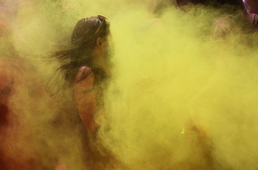 Pistolas de agua, cubos, pigmentos -lo habitual es que estén hechos de una mezcla de harina de maíz y colorantes llamada gulal'- y aerosoles son las armas empleadas por los participantes en el festival. En la imagen, estallido de polvos de color amarillo durante el Holi en Howrah, un distrito de Bengala Occidental.