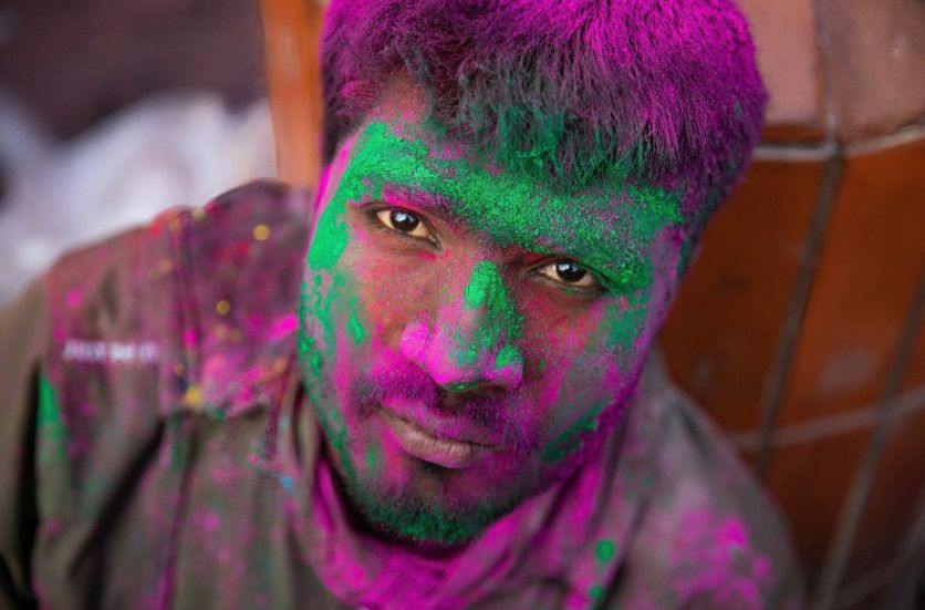 A pesar de que es una festividad que rinde culto al dios hindú Visnú, el significado religioso suele quedar en segundo plano por detrás de las ganas de diversión que tiñen todo de rojos, verdes, azules, rosas y amarillos. En la imagen, detalle del ojo de un militar indio, cubierto en polvo amarillo, en la ciudad de Srinagar.